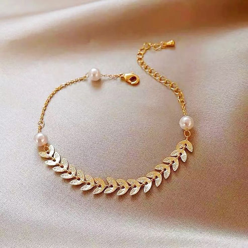 - Stainless steel bracelet adorned with elegant wheat ear and pearl motifs